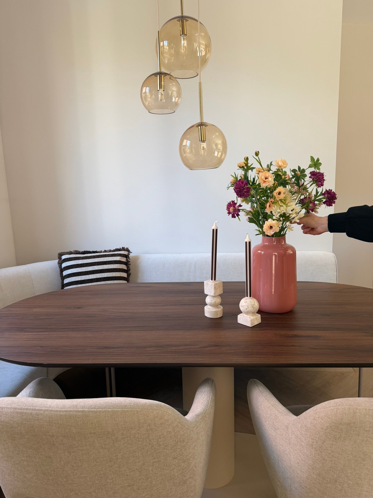Het boeket wordt geleverd zonder vaas. Op de foto is het boeket 'Purple Dawn' te zien met Juna Smoke vaas en de Lily pink vaas van beiden 30 cm hoog.